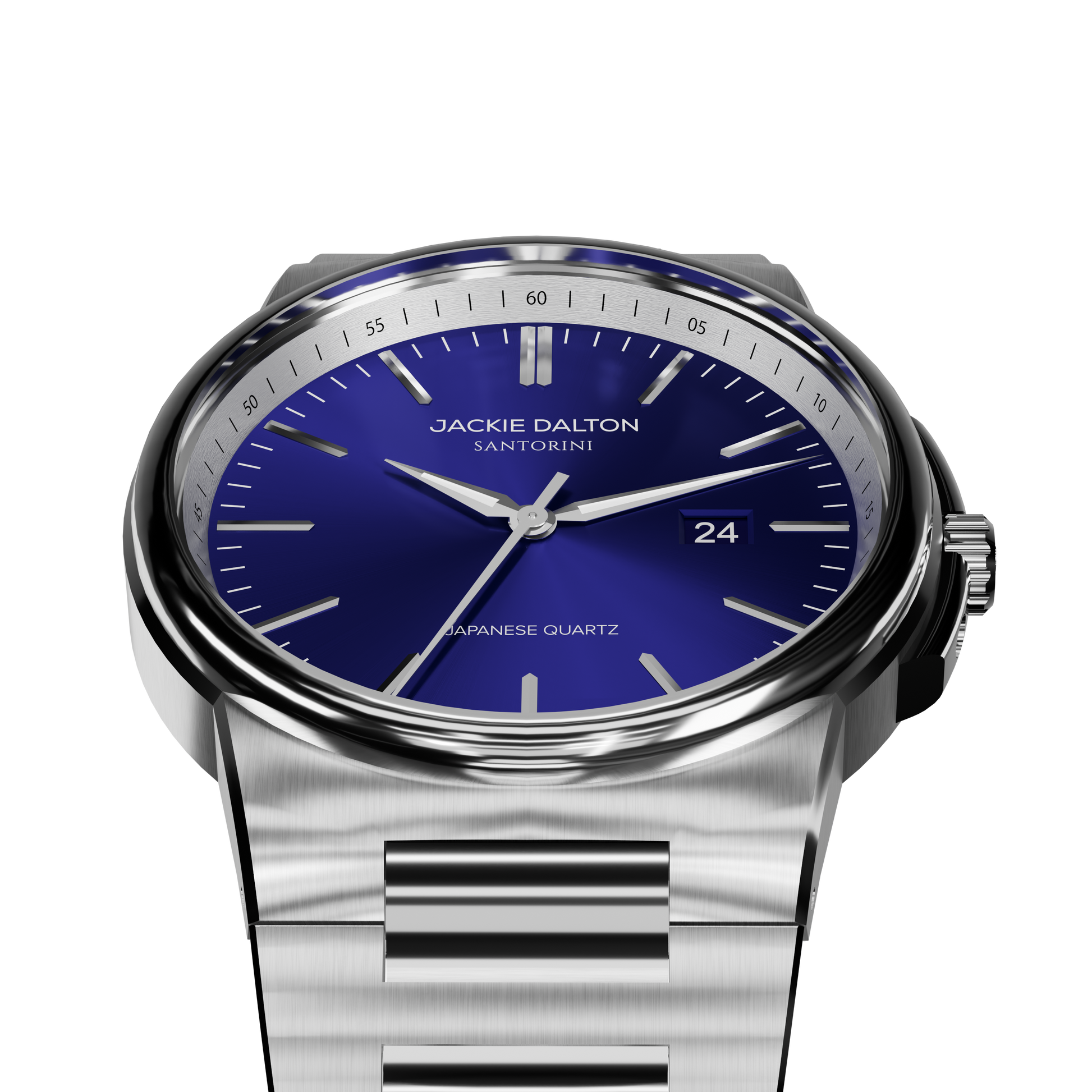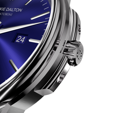 The new Ocean Blue from the Santorini Collection captures the calm depth and radiant beauty of the Aegean Sea. Its sunray dial in a rich oceanic hue reflects light with every movement, paired with a brushed and polished case and bracelet that elevate its refined design.